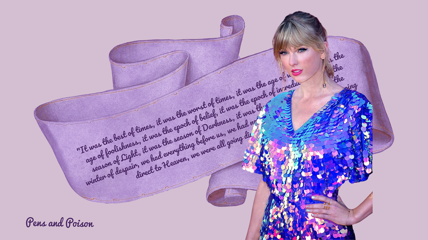 Featuring rabbit holes and Cheshire cat smiles, 1989’s “Wonderland” was an homage to Lewis Carroll; Reputation’s “Getaway Car” opened with a play on Dickens’ most famous opening line (“It was the best of times/the worst of crimes”); and folklore’s “the lakes” was an explicit nod to the Lake Poets. Soon, both TikTok videos and peer-reviewed essays teemed with literary criticism of Taylor Swift’s songs, with several professors arguing that we should study Swift alongside Shakespeare and with Harvard—among other prestigious universities such as Stanford and NYU—going so far as to implement a full-semester course on Taylor Swift in their English department.